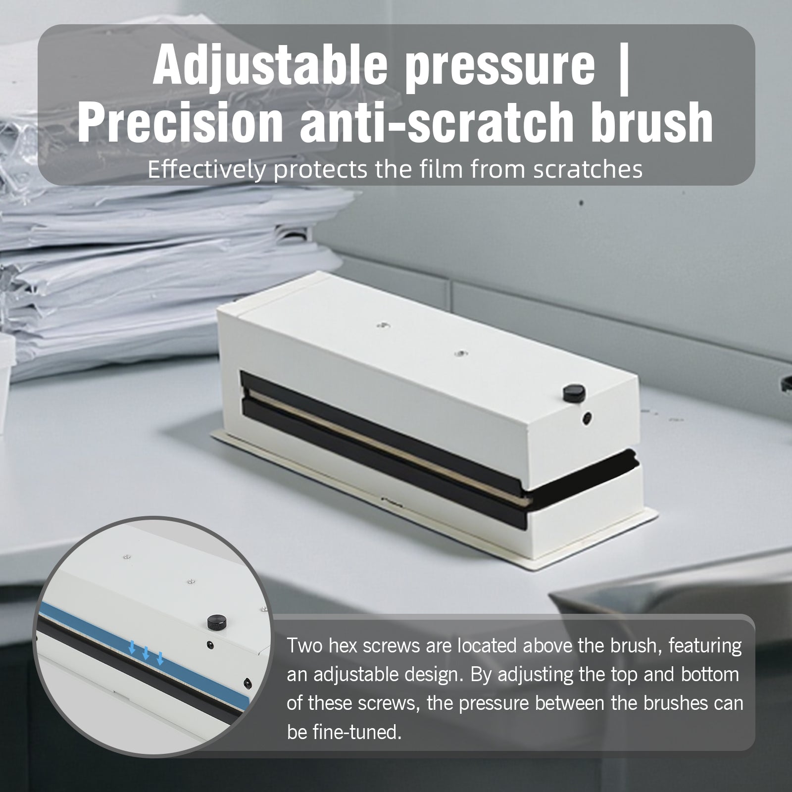 4. Adjustable pressure. Precision anti-scratch brush: Effectively protects the film from scratches. Two hex screws are located above the brush, featuring an adjustable design. By adjusting the top and bottom of these screws, the pressure between the brushes can be fine-tuned